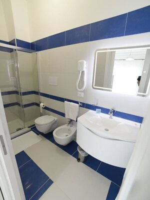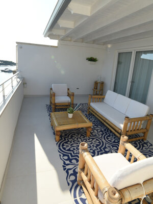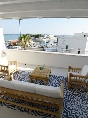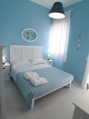 Bellissima struttura in stile Mediterraneo situata nel centro di Porto Cesareo con balconi e terrazzo vista mare. Le grafiche decorate dei pavimenti rievocano la mestria dell'antica arte ceramica decorativa rielaborata secondo i canoni del design contemporaneo. Una proposta destinata a durare nel tempo, non legata alle mode. I colori sono vividi, caldi e decisi ed esprimono il massimo del loro potenziale, rievocando l'incanto e la suggestione del mare di Porto Cesareo, conferendo agli ambienti uno stile fresco e solare. Gli arredi sono lineari e puliti ed estremamente accoglienti rievocando le imbarcazioni tipiche dei pescatori del luogo.